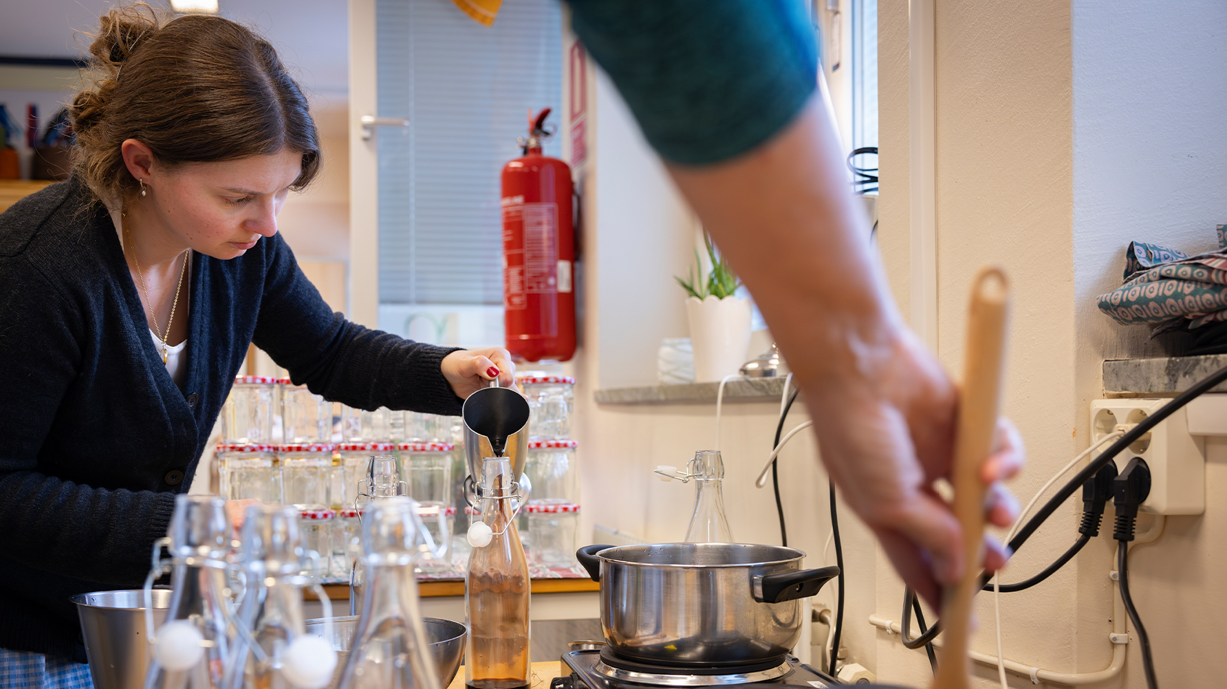 Runt omkring Taraneh Rahimi står hennes kurskamrater vid sina skärbrädor och glasburkar, i färd med att göra samma blandning. Slutligen täcker de lök- och rotfruktsbitarna med ofiltrerad äppelcidervinäger och skruvar lock på burkarna. Nu ska mixturen få stå och dra tills de kommer hit till skolan igen om en månad. Då ska honung tillsättas för att mildra smaken. De som har lust kan också fixa extra hetta med hjälp av lite cayennepulver. Eldcider kallas drycken, som ska ha en stärkande och skyddande effekt vid förkylning.