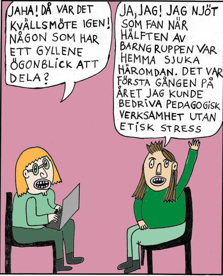 För egen del har hon redan börjat rulla ut seriestrippar under samlingsnamnet ”Förskolan – bakom kulisserna”. Ett tiotal strippar finns på hennes Instagramkonto och Förskoleupproret sprider dem på sin Facebooksida.