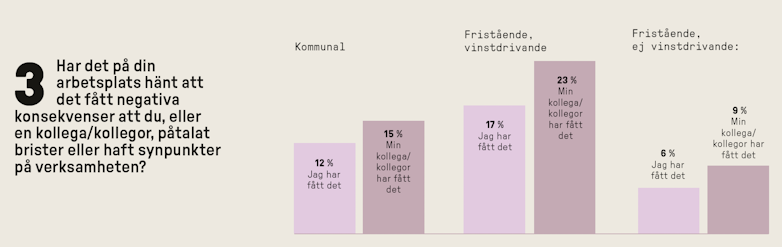 På fristående vinstdrivande förskolor svarar så många som 38 procent av förskollärarna att de inte vågar engagera sig fackligt eller är rädda för eventuella negativa konsekvenser. I kommunal verksamhet är det 25 procent som svarar detsamma.