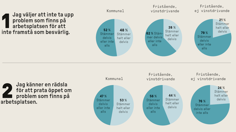 Tystnadskulturen i skolans värld är utbredd, och förskolan är inget­­ undantag. Värst drabbade är de som arbetar i kommunala och fristående, vinstdrivande verksamheter. Där vittnar 38 respektive 46 procent av de tillfrågade förskollärarna att det i ganska eller mycket stor utsträckning finns en tystnadskultur på arbetsplatsen. På kommunala förskolor undviker dessutom hälften av de tillfrågade att ta upp problem för att inte framstå som besvärliga.