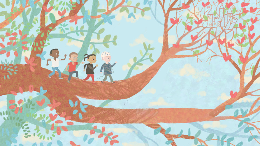 I dag ska alla barnen klättra i de bästa lekträden, Klätterstegsträdet, Raketen, Spindelträdet och Älvans träd. Men när lillasyster kommer drar de upp klätterstegen för hon är så liten och jobbig. Sedan klättrar de, fastnar i jättespindelns spindelnät, blir nästan uppätna av en rymdval! Till slut kommer de till Älvans träd och klättrar högt för att komma till slottet där älvan bor och till skatten. Uppåt! Uppåt! Så börjar grenarna gunga och de har kommit för högt …