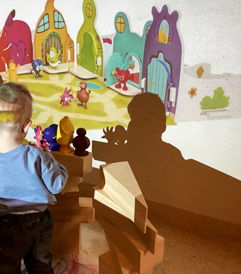 Barnen fick läsa böckerna tillsammans på väggen (med hjälp av projiceringar) och vara interaktiva med sagan, som att knacka på dörren. Vi projicerade i kuben där de utforskade hur ljuset och bilden kan förändras.