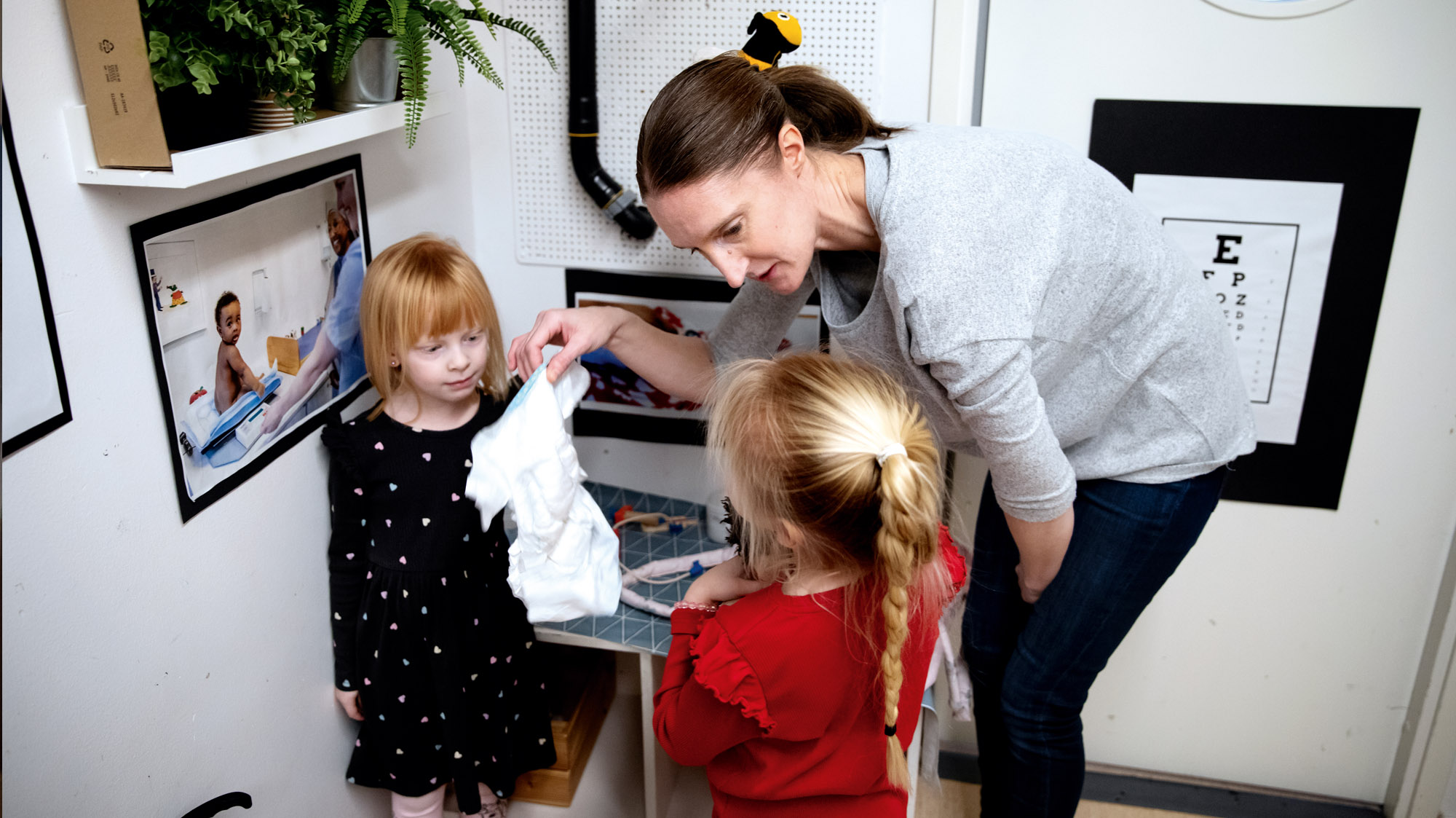 Tuva och Bella i den spännande BVC-lekvärlden tillsammans med Tina Stjärnström, lärare i förskolan.