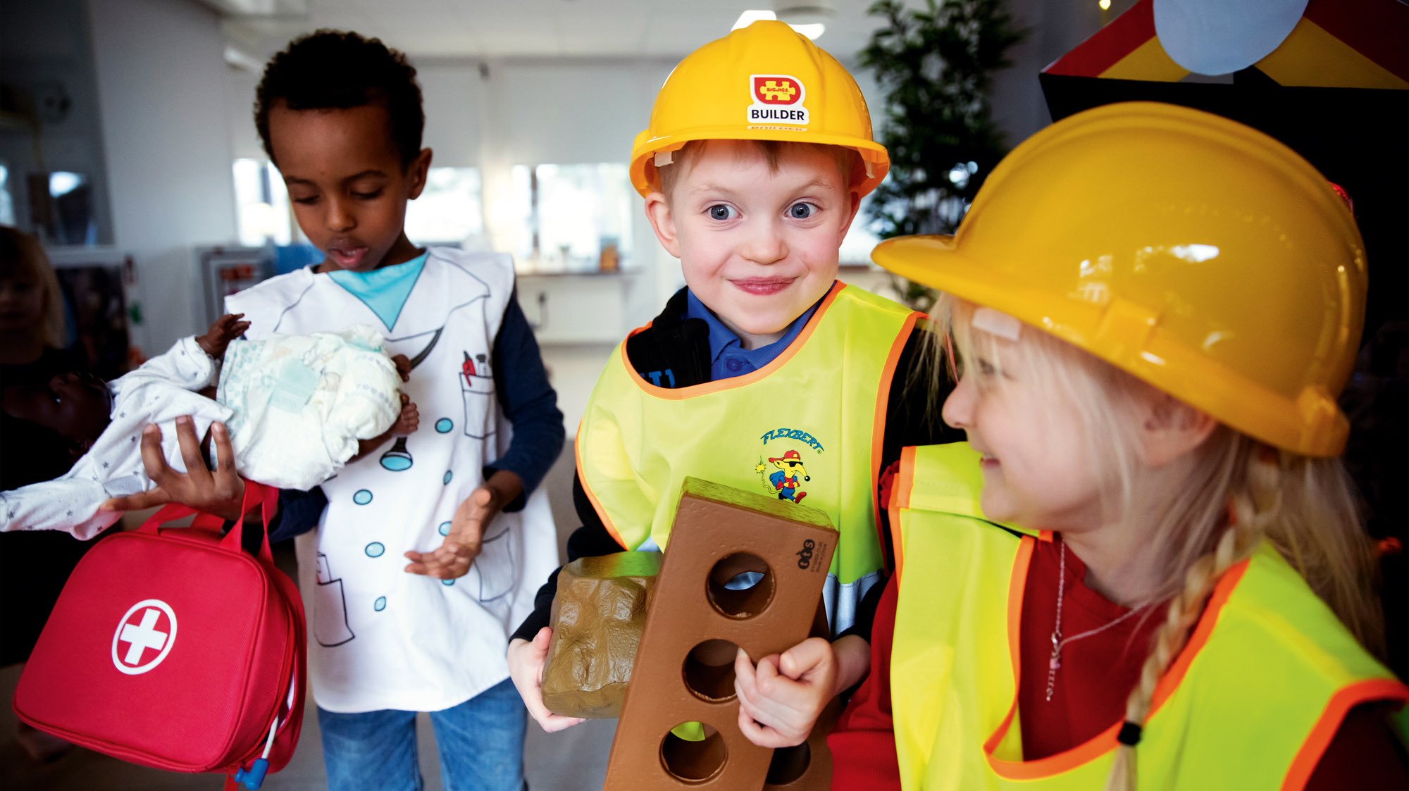Yuusuf har varit i lekvärlden BVC, medan Arvid och Bella leker snickare.
