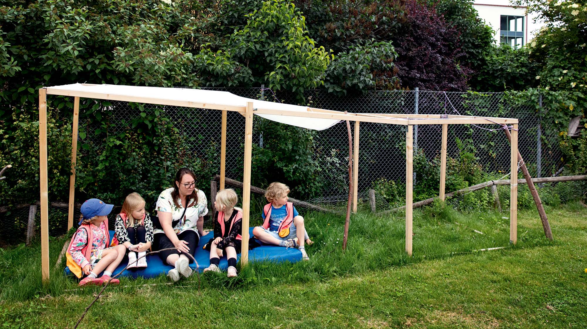 Madrass, barn och förskollärare har tagit plats på gårdens läshörna.