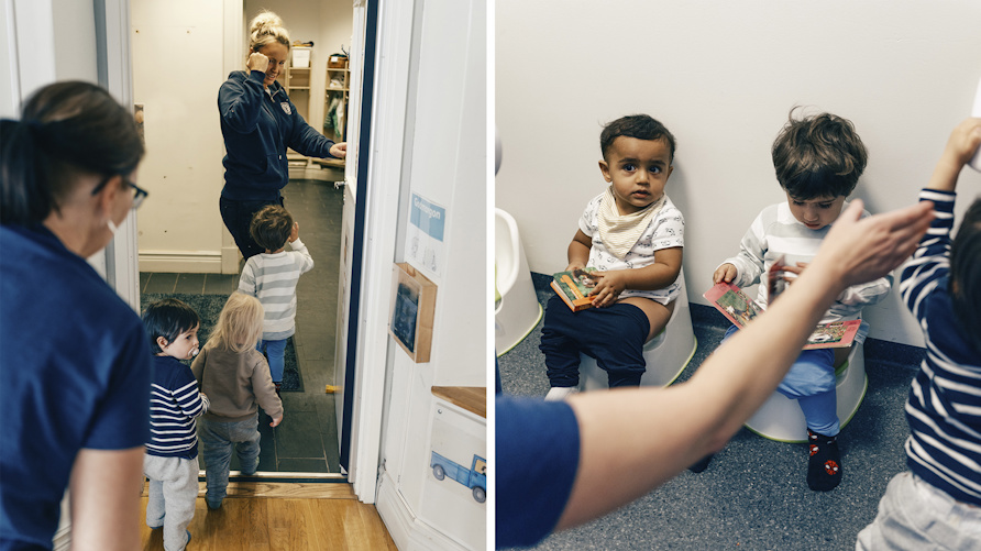 2. Se till att toalett-/pottbesöken blir lugna och roliga – några få barn i taget, erbjud böcker, berätta sagor, ramsor, sjung och prata med barnen.