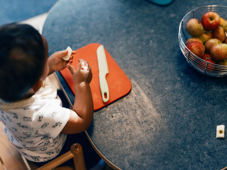 Innan vi tar farväl får vi även vara med på fruktstunden. De små sitter vid bordet med varsin liten skärbräda framför sig och skär själva sitt äpple med säkerhetsknivar. Så små, och redan så självständiga, och med torr blöja, eller ingen alls.