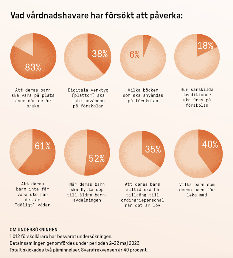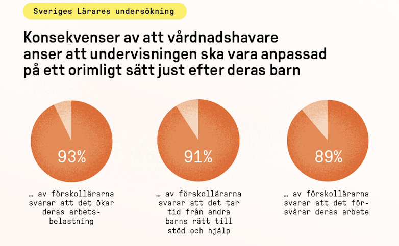 Var fjärde förskollärare i Sveriges Lärares undersökning upplever att de flera gånger per månad kontaktas av föräldrar med orimliga krav. Nästan alla tillfrågade uppger att deras arbetsbelastning ökar och att deras arbete försvåras när vårdnadshavare vill att undervisningen ska vara anpassad på ett orimligt sätt för just deras barn. Nästan lika många svarar att det även tar tid från andra barns rätt