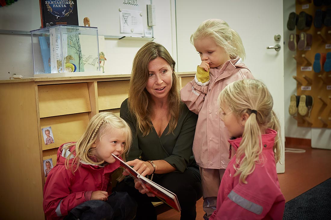 Läsning är i fokus på Kålhagen, förskollärare Anna Wågdahl läser för nyfikna barn på avdelningen Planeten. Foto: Anna von Brömssen