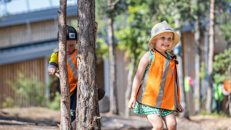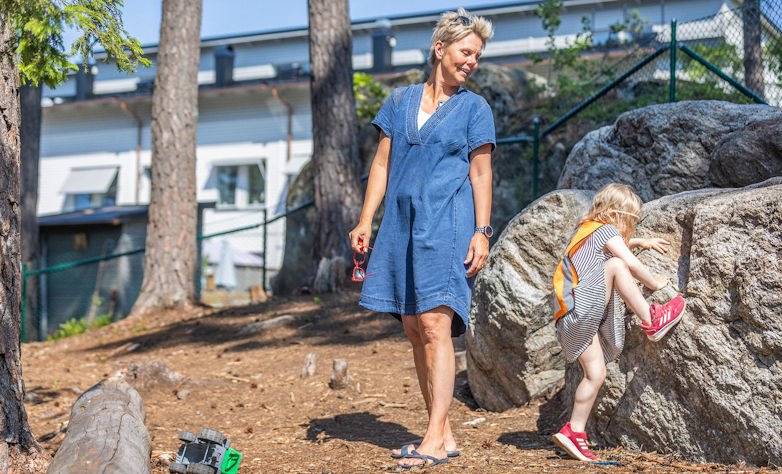 – Det är den bästa delen, orörd utemiljö. Det blir helt olika sorters lek där. Barnen hoppar och springer gärna längs de barkförsedda slingriga vägarna och nedför backen. De plockar stenar och pinnar. Det är favoritplatsen, en naturlig samlingsplats dit de ofta vill gå när de får önska. Jag tror att det beror på att de kan leka avskilt där, att det finns så många skrymslen och vrår.