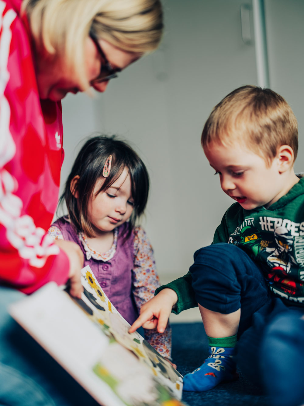 Alexander och Matilda lyssnar noga på Johanna Larsson som läser ”Mina första bondgårdsdjur”. Jungfrustigens förskola i Mölndal är litteraturcertifierad.