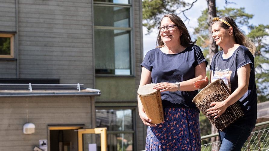 – Vi arbetar med de allra yngsta, 1–2-åringarna, på Väringaskolans förskola i Sigtuna, och när det var dags för inskolning i augusti märkte vi hur musik och rörelse var ett bra sätt att avleda barnen vid lämning. Där och då visste vi inte hur stort projektet faktiskt skulle bli. Först var det bara musik och dans, men sedan insåg vi snabbt att det här var ett spår att jobba vidare med. Bland annat genom att involvera skapande. Vi två hade heller inte arbetat ihop tidigare så man kan säga att vi fann varandra via musikprojektet, berättar Anna Wester, som är förskollärare, och Gabriella Wiberg, som är barnskötare på avdelningen.