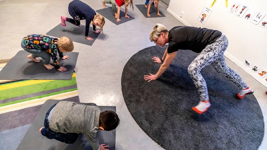När de fyra minuterna passerat pustar de ut en liten stund innan det är dags för ett kort yoga-pass. Tillsammans med Mia går barnen igenom positioner som Katten, Hunden och Barnet.