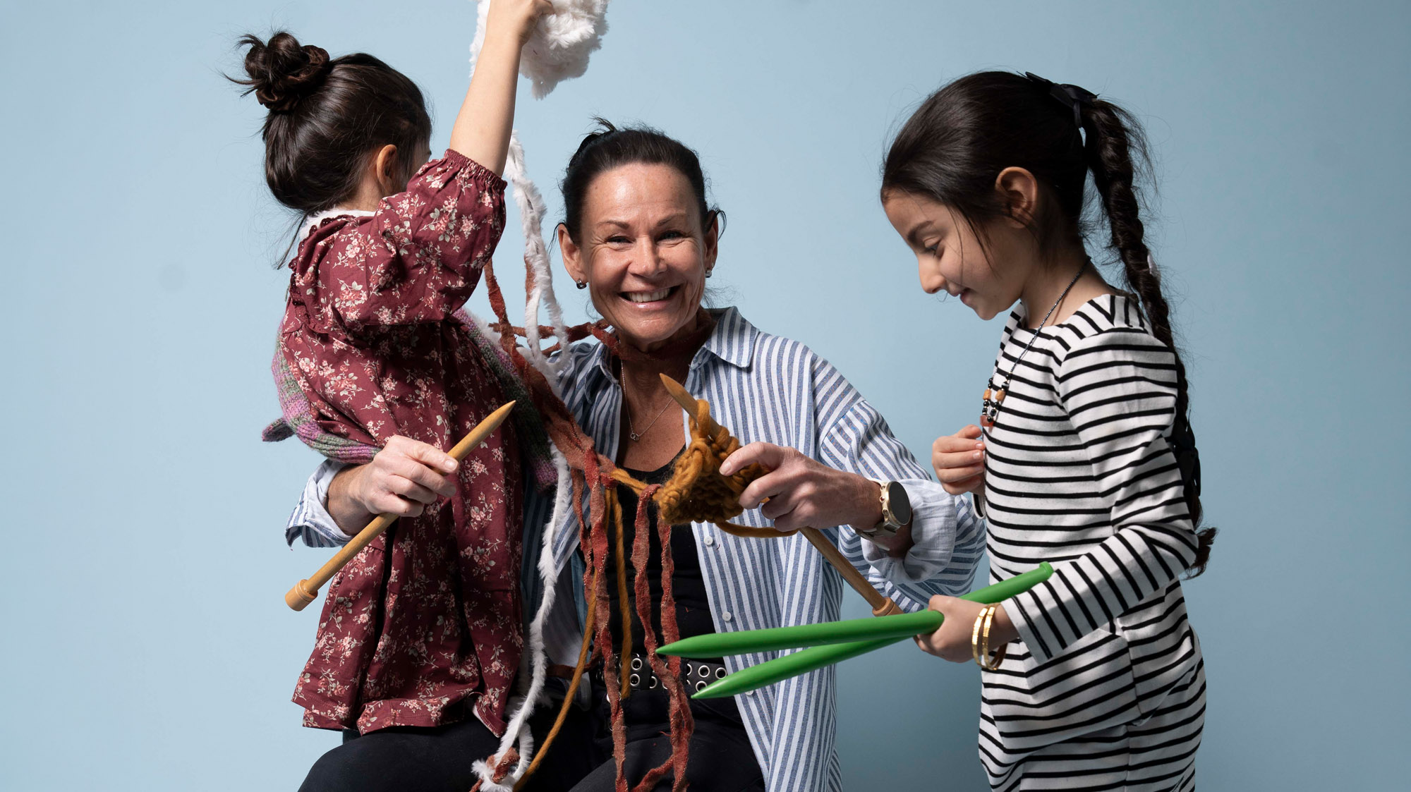 Läraren Susanne Andersson med Laila och Nada på Lussebäckens förskola, som bland annat fixat garn som sedan blivit vantar till hemlösa.