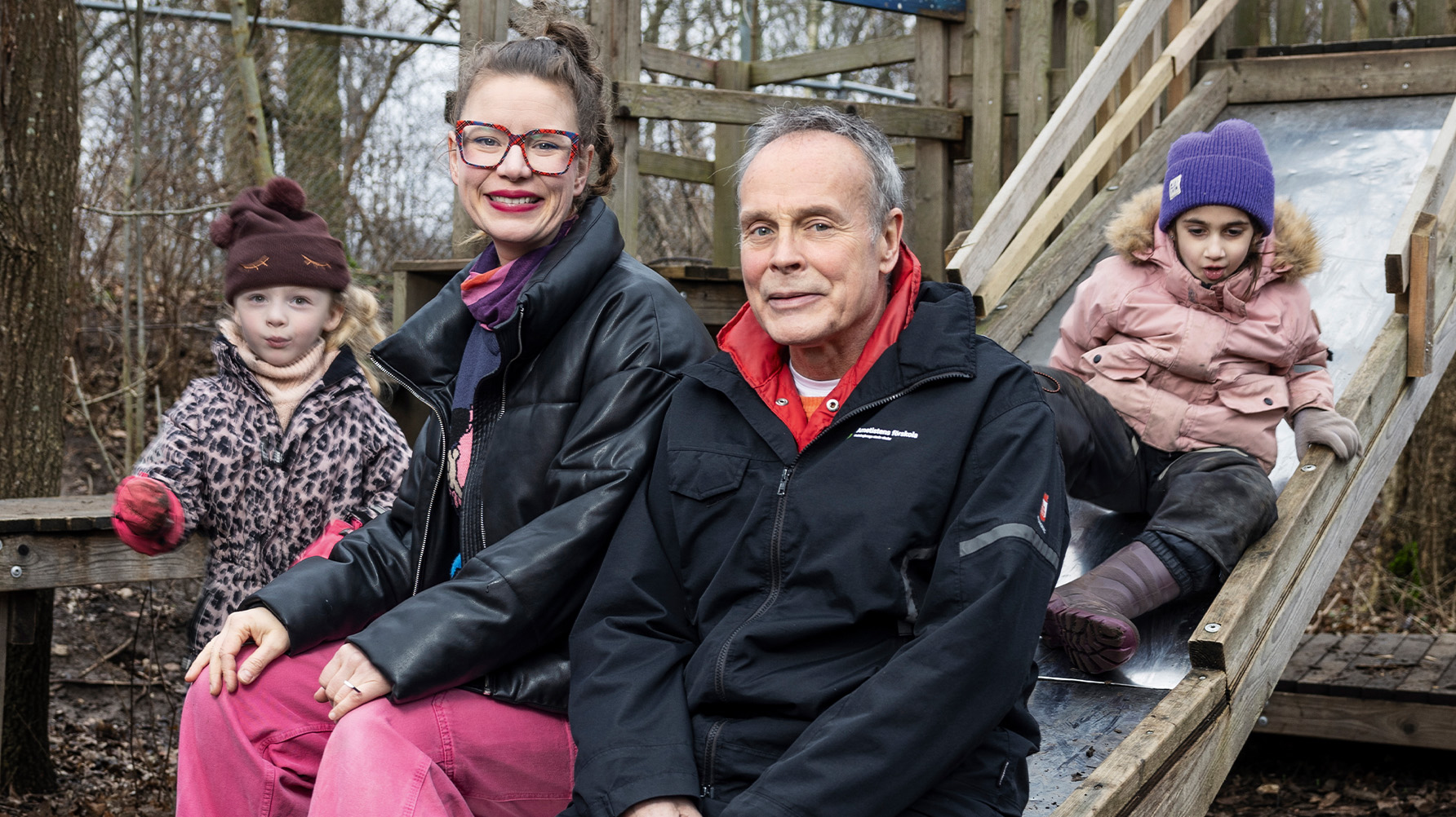 Kristina Schultz och Sven Stedt på den färdiga rutschkanan med barnen på förskolan.