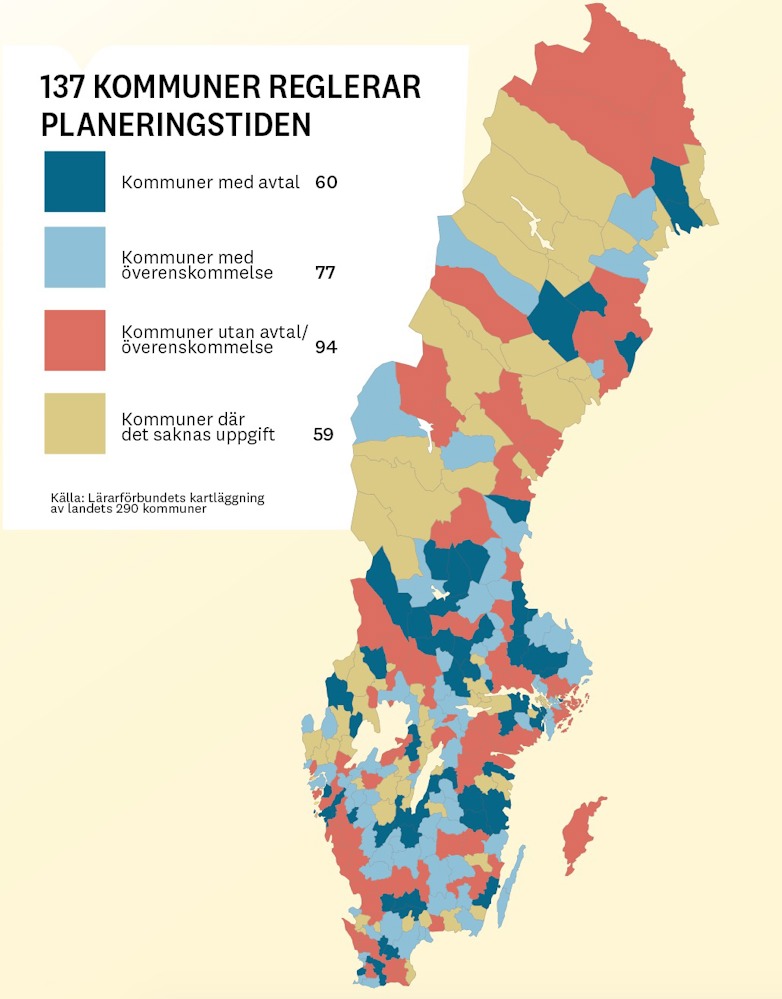 22% i Lärarförbundets enkät om planeringstid svarar att de under det senaste halvåret dagligen har planerat undervisningen samtidigt som de är i barngruppen. 41% svarar att det händer någon eller några gånger i veckan. Källa: Lärarförbundets kartläggning av landets 290 kommuner