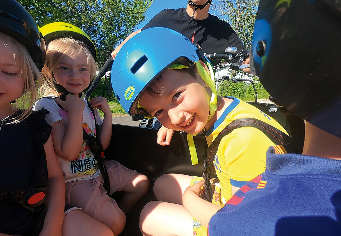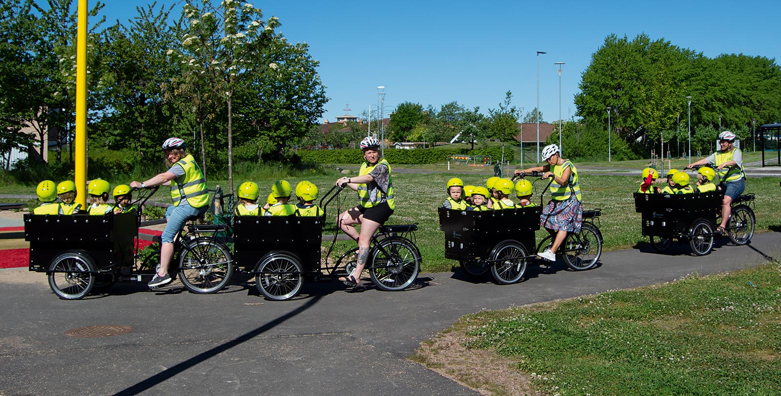 Med sex barn i varje låda susar pedagogerna fram på vägarna. De passerar ängar och gula rapsfält, och farten gör att barnens hår fladdrar under hjälmarna. De skrattar, pekar, vinkar och berättar för varandra vad de ser. Satsningen på lådelcyklar har verkligen blivit en succé.