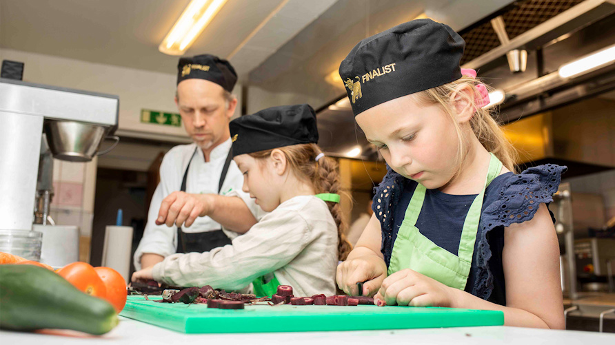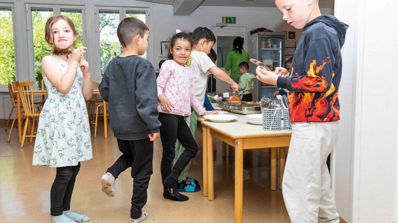 Leah Appelgren och Olivia Durbas kommer in i köket. De, som snart ska börja i förskoleklass, tvättar händerna. Noggrant. Innan de kan börja arbeta hjälper förskolekocken Johan Engman dem med de egentligen för stora gröna förklädena. Stående på pallen som gör att de kan nå upp ordentligt till arbetsbänken får de, med svarta kockhattar på huvudena, hacka gurka samt skala och skära svarta, orangea och lila morötter.