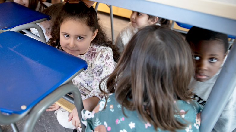 – Krypa under en stol, svarar barnen och letar kvickt upp varsin stol som de kryper in under.