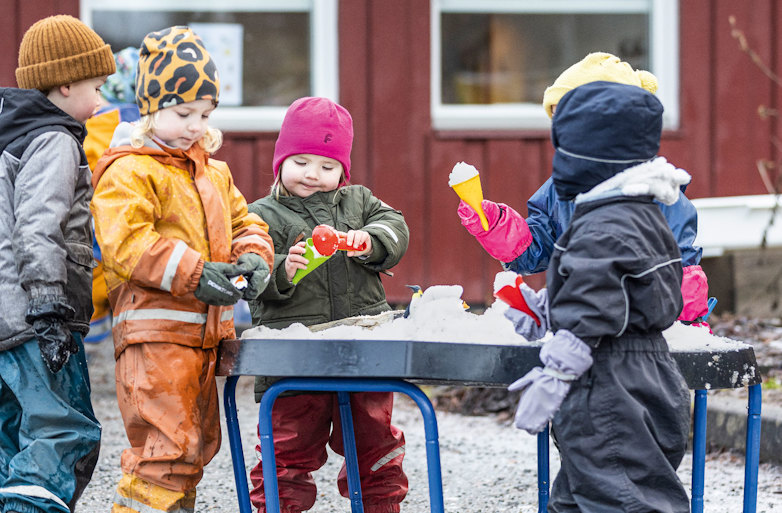 Barnen verkar dock inte bry sig nämnvärt, vare sig om bollbanans öde eller vädrets växlingar. De har fullt upp med att undersöka vad dagens stationer erbjuder under utevistelsen. Vid ett av borden lockar en uppsättning vinterpenslar, pinnar med blåfärgade fastfrusna isbitar i ändarna. Barnen testar genast att måla på den gröna duken. Intill finns även ett memory, små inplastade fiskbilder som plockas upp med hjälp av ett litet magnetspö.