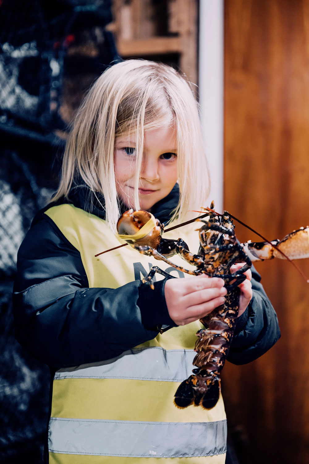 Helle vågar hålla i en hummer när förskolan besöker sjöboden. Foto: Fredrik Jalhed.