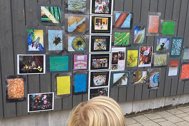 5. Temat avslutades med en fotoutställning på gården. Barnens mikroskopbilder och grönsakscollagen visades upp för kompisarna och föräldrarna. De laminerade bilderna sitter kvar ute och väcker fortfarande samtal bland barnen.