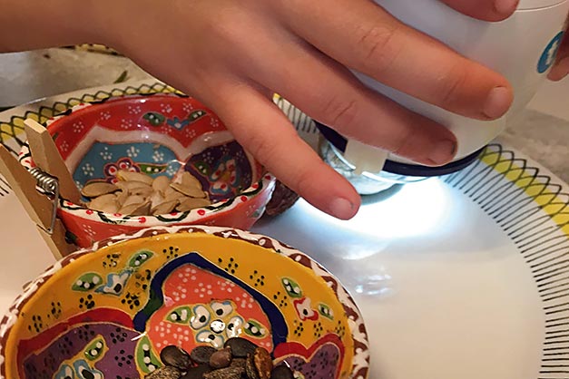 1. 3–4-åringarna började med att leta detaljer i målningar och övergick sedan till att studera blommor, blad och levande insekter i mikroskopägget.<br />