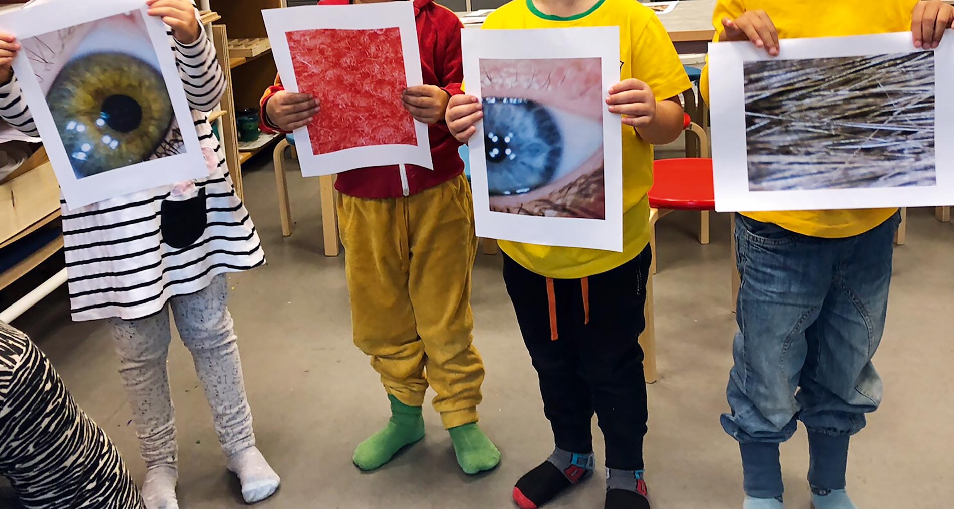 Både konsten och naturen har inspirerat barn och pedagoger här. Startskottet för projektet var att spana efter insekter i holländaren Jan Davidszoon de Heems 1600-talsmålningar föreställande fruktfat där även småkryp syns. Sedan var de redo att titta närmare på fysiska löv, barr, blommor och levande insekter. Barnen ville också undersöka kroppen – hår, hud och ögats iris – med hjälp av mikroskopägget.