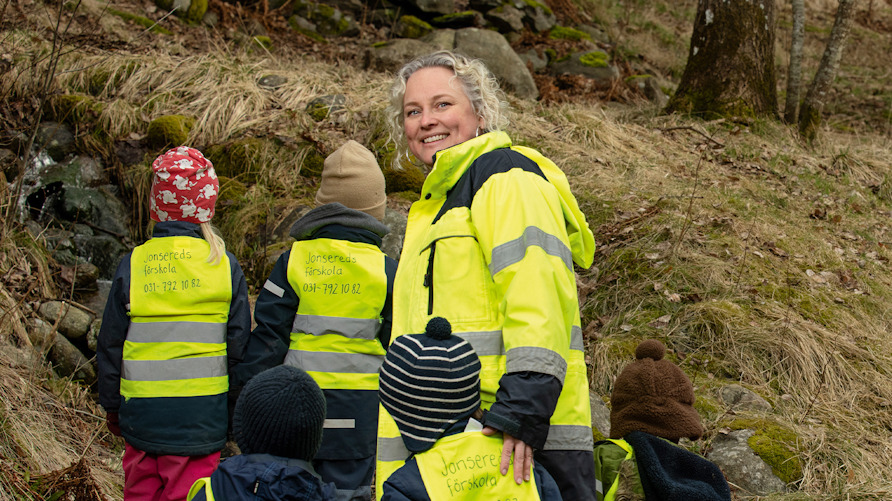 En barngrupp på Jonsereds förskola är ute på skogspromenad. De traskar på i god fart och deras förskollärare har inga problem att hänga med. Men så var det inte för bara några veckor sedan.