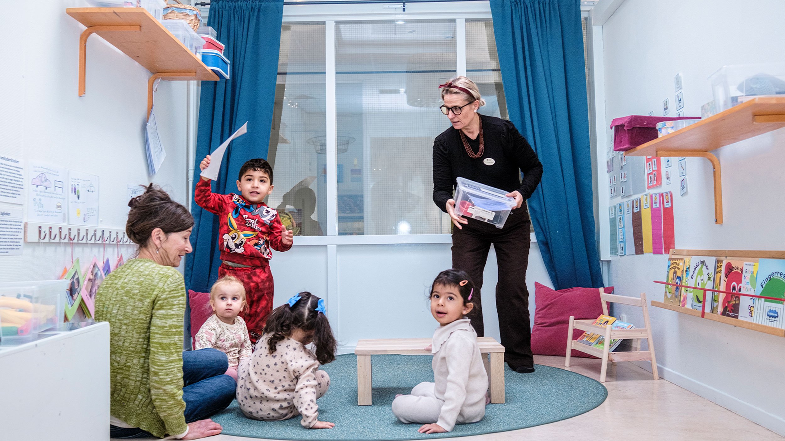 Vi lämnar Dina Shabo och storbarnsavdelningen en stund, korsar korridoren som rymmer ett av förskolans flera bibliotek, och kliver in på småbarnsavdelningen Grodan i stället. Här hittar vi lärarna i förskolan Biljana Koneska Peovska och Kerstin Kasim, tillsammans med barnen Asal, Emilie, Zofia och Elyano. Alla sex sitter ner på en rund matta, kring ett bord lågt nog att passa de fyra 1–2-åringarna.