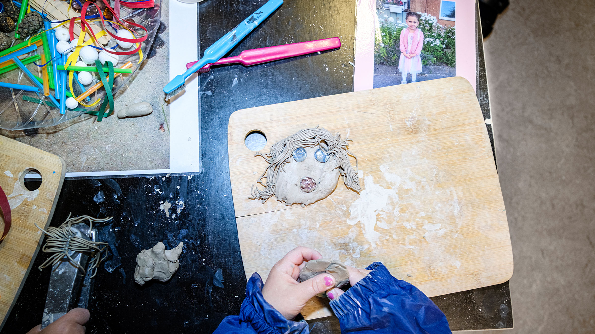 På det lilla bordet ligger ett laminerat A4-ark fullt med text och färgglada teckningar, ett något mindre blåmålat papper, en leksaksbil, en pappmugg innehållande gula piprensare och en urklippt bild på Elyano – manus och rekvisita för att återge berättelsen om hans dagsutflykt med familjen.