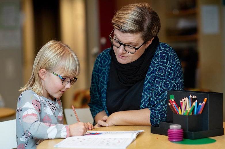 Lärande i förskoleklass ska göras med fantasi och kreativitet. Här får Kajsa får lära sig att skriva bokstaven B. Foto: Malin Grönborg