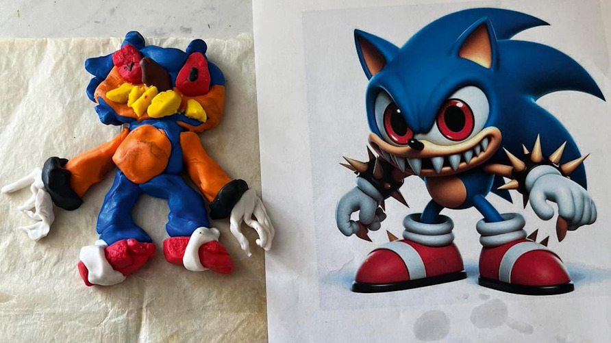 2+3. ”När eleven var helt nöjd med bilden i programmet skrev vi ut den på papper. Sedan började eleverna och vi i personalen att skapa en avbild av karaktären i cernitlera. Alla figurer brändes i ugn och monterades på en liten brädbit.”
