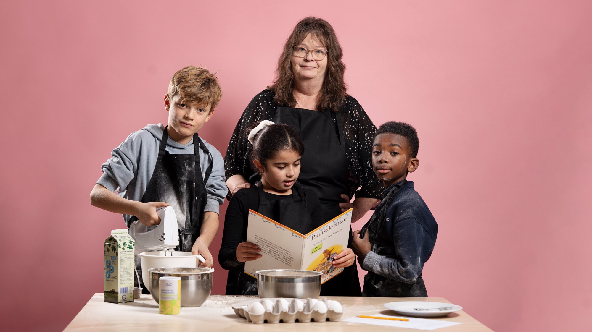Noah, Rayan och Timothy gör gärna pannkakor. Ett bra tillfälle att läsa Sven Nordqvists Pannkakstårtan, tycker Anna-Maria Olsson.