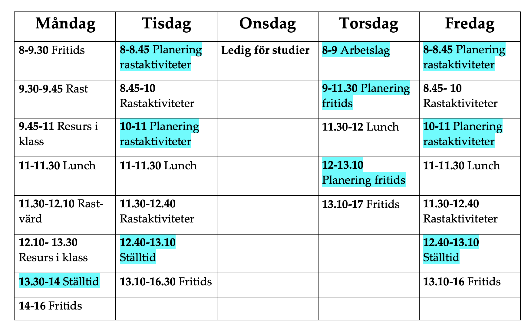 I Mjölby kommun finns ett lokalt avtal som ger lärarna i fritidshem sex timmar planeringstid i veckan. Om man räknar in Jonna Gustafssons planeringstid för rastverksamheten så har hon sammanlagt 9,5 timmar. En förmiddag ägnas helt åt fritidsplanering, både med hela arbetslaget och med kollegan på den egna avdelningen.