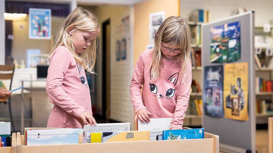 Barnen tar av sig skorna i korridoren utanför skolbiblioteket innan de tyst tassar in. Jenny Söderberg har just påmint dem med frågan: ”Hur får man vara inne på biblioteket?”. Svaren kom snabbt: ”Tysta!”, ”Inte springa omkring!”. Väl inne i biblioteket stannar Jenny Söderberg framför tre boklådor märkta med stora bokstäver. Hon förklarar för den lilla gruppen på åtta förskoleklasselever att dessa böcker får de låna, de andra i hyllorna får de fråga skolbibliotekarien Bozena Mirowska om. När Jenny Söderberg berättat var barnen kan sätta sig och läsa, hämtar flera genast böcker ur lådorna och slår sig ner i sittpuffar och på mattor på golvet. Inez frågar om Jenny Söderberg kan läsa högt för henne ur ”Lejonkungen”. Efter en stund sätter sig en kompis bredvid och lyssnar.