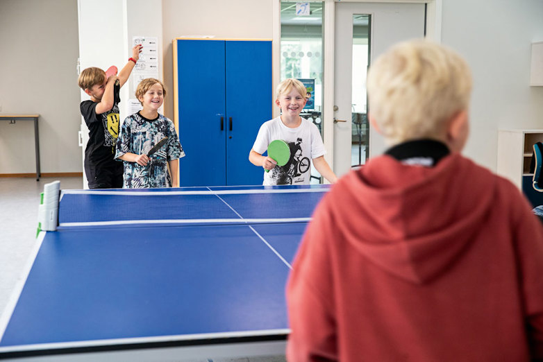 Filip, Sixten och Harry spelar pingis i korridoren.
