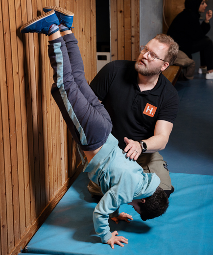 Robin Sarenvik hjälper en elev att klättra upp i handstående.