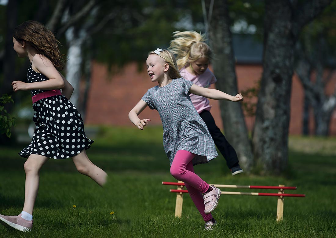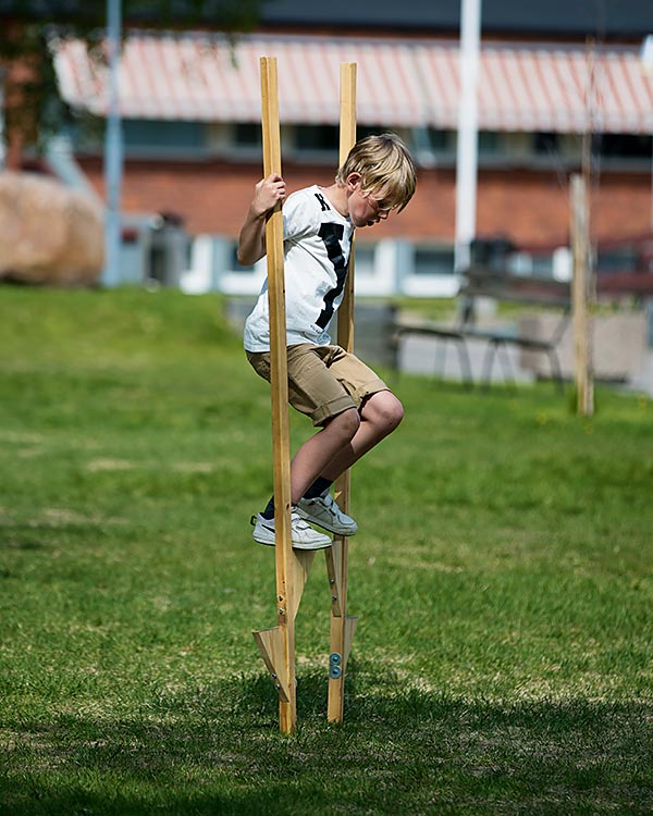 Arbetet pågick under hela förra läsåret och mynnade ut i hästhoppningshinder, styltor och balansbrädor, samt stavar till den Mästarnas mästare-inspirerade leken ”nattduellen”. Än så längre har slöjdeleverna arbetat i mindre skala. Varje elevgrupp tillverkade ett par föremål var. Som avslutning levererade högstadieeleverna föremålen på skolgården – till stor glädje för de yngre barnen.
