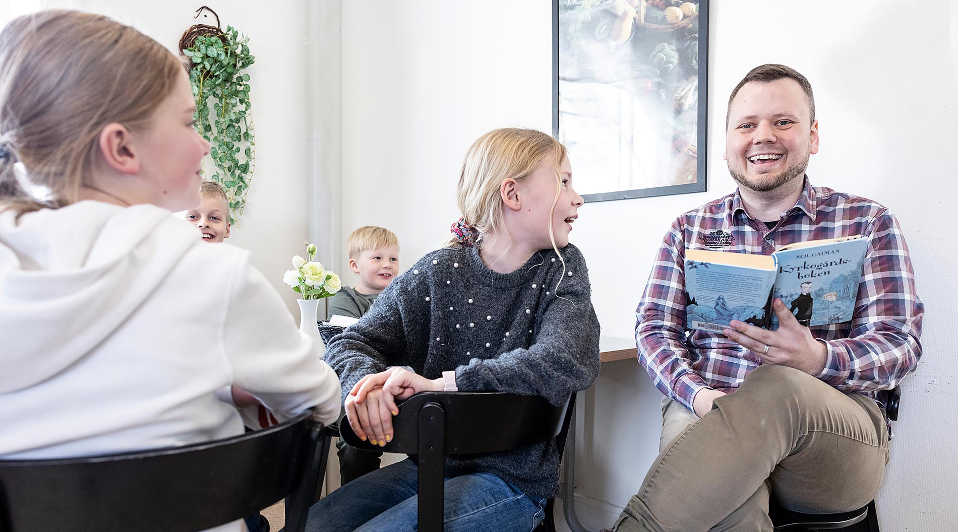 Han blev färdig lärare för tre år sedan och Gudmuntorps skola är hans första arbetsplats. Att jobba systematiskt med läsning i verksamheten tog han med sig från en inspirerande handledare under VFU:n på ett annat fritidshem. Nu har han hållit i den regelbundna läsningen i drygt två års tid. Förutom högläsning vid mellanmålet som i dag, får aktiviteten ringar på vattnet även i övrig fritidshemsverksamhet.
