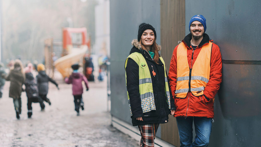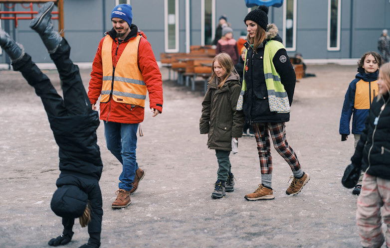 Det är lunchrast på Utsäljeskolan i Huddinge och barnen jagar varandra på den snöslaskiga skolgården, som är en platt fyrkant omgärdad av grå baracker. Anton och Eva-Lie Johansson lyser upp i det gråa med sina neonfärgade västar och hälsar glatt medan nyfikna elever samlas runt oss och fotografen.