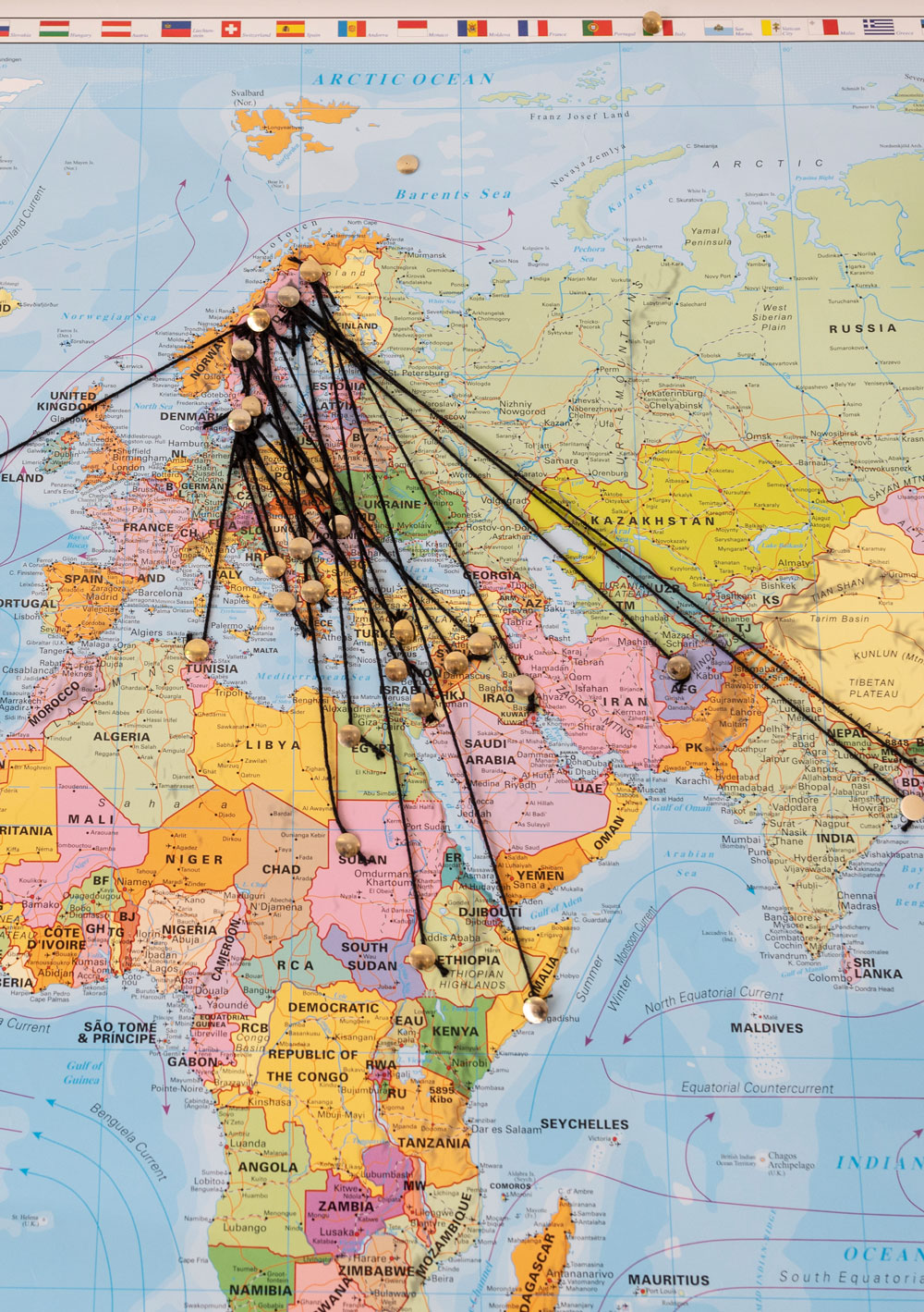 Trådarna visar fågelvägen till alla de länder som fritidshemsgruppen ska besöka i fantasin.
