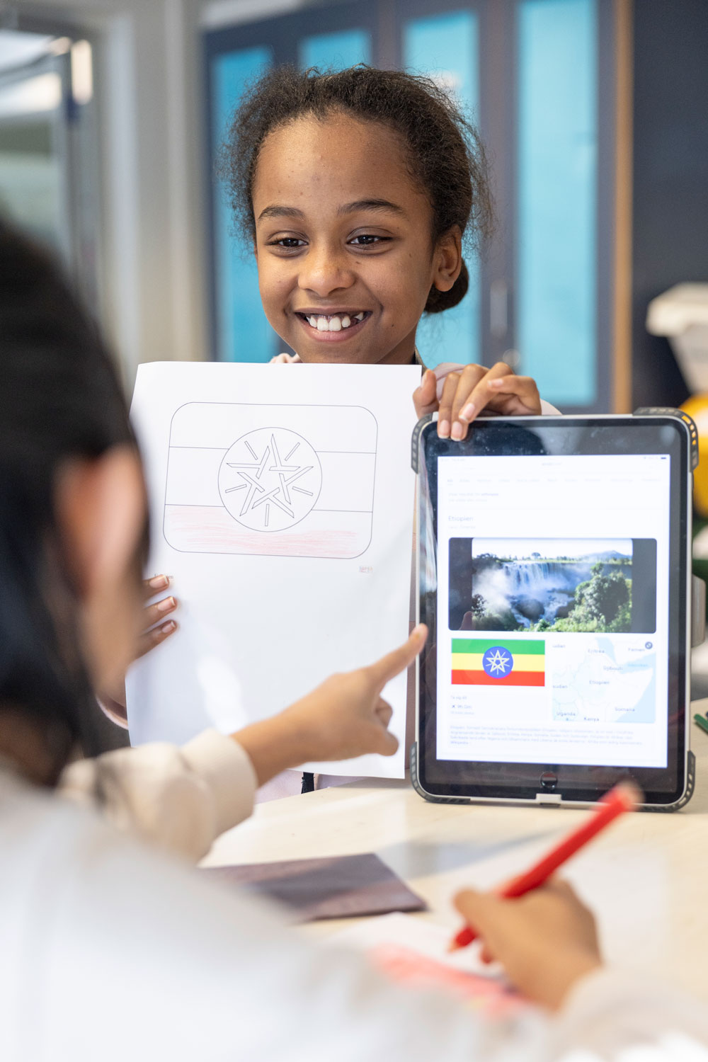 Antal länder hade kunnat vara ännu fler eftersom många av de cirka 65 elever som är inskrivna på Diamanten – ungefär 50 brukar vara på plats varje dag – har anknytning till mer än ett land utöver Sverige. Men för att hålla nere antalet har alla fått välja ett av sina länder som fiktivt resmål. Det hindrar inte att eleverna får lov att uppmärksamma alla sina länder på andra sätt. Till exempel genom att färglägga flera flaggor. En aktivitet som i dag sysselsätter halva fritidshemsgruppen i rummet bredvid väsktillverkningen.