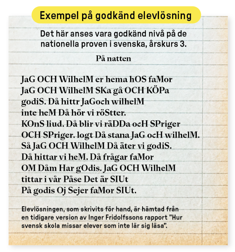Läsa-skriva-räkna-garantin ”Hur svensk skola missar elever som inte lär sig läsa”. Så heter en ny rapport skriven av specialläraren Inger Fridolfsson. Hennes slutsats: Skolverkets bedömningsstöd är verkningslöst eftersom många elever lyckas dölja sina lässvårigheter genom att gissa sig till rätt svar på testen. Dessutom är kraven för lågt ställda.