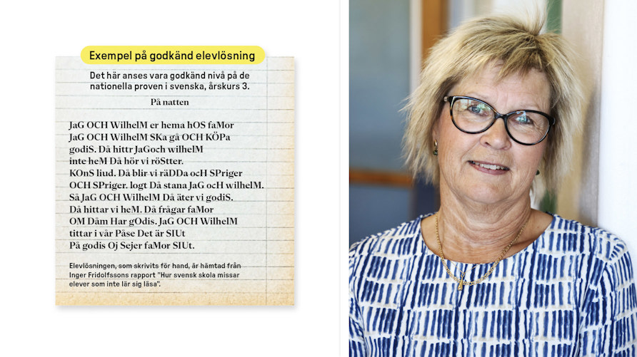 Inger Fridolfsson skrev nyligen rapporten ”Hur svensk skola missar elever som inte lär sig läsa”, som har fått stor spridning i Skolsverige. Hon är framför allt kritisk till hur Skolverkets bedömningsstöd testar elevernas avkodning. Orden som ska avkodas är för få och läses i löpande text, vilket gör att eleverna tar hjälp av kontexten, menar hon.