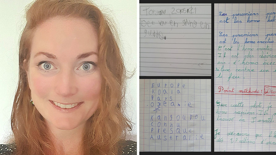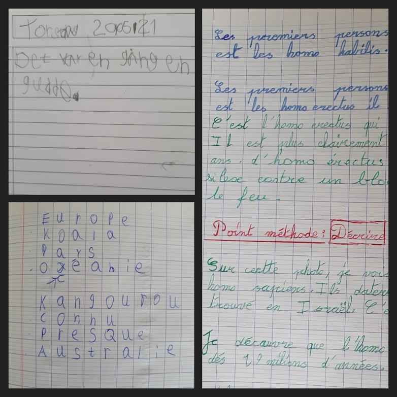 Överst till vänster: Sonens handskrift i maj 2021, precis när familjen flyttat till Frankrike. Nederst till vänster: Sonens handskrift efter en månad i Frankrike. Till höger: Sonens handskrift idag, efter 1,5 år i Frankrike.