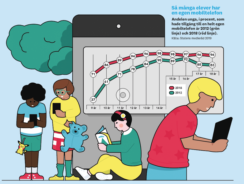 Antalet barn och unga som har en egen mobiltelefon har skjutit i höjden de senaste åren. Allra störst är ökningen bland de yngsta. 2012 hade exempelvis 37 procent av landets nioåringar en egen telefon. Sex år senare var motsvarande siffra 71 procent.