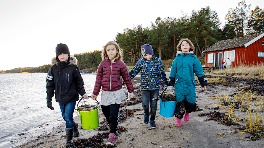 Det är också en del av pedagogiken på Koster, att göra det man kan göra med alla barnen tillsammans. Den här dagen bär det av till stranden för att plocka tång, som ska bli näring åt skolans odlingar i Kosters trädgårdar.