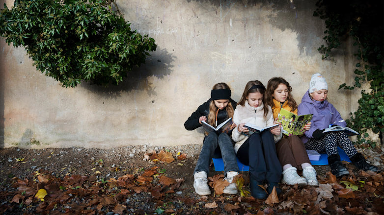 Lutade mot en mur sitter fyra tjejer djupt försjunkna i varsin bok.