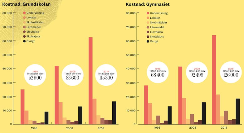Trots att det ofta talas om att skolan tvingas spara hade anslagen 2018 ökat ganska kraftigt jämfört med tio och 20 år tidigare. 1998 var skolornas genomsnittliga utlägg per grundskoleelev knappt 53 000 kronor medan det tio år senare hade ökat till drygt 83 000 kronor. Det betyder att kostnaden för en grundskoleelev har ökat med 58 procent under de senaste tio åren och med hela 130 procent under de senaste 20 åren. Kostnaden för gymnasieelever ökade under samma period med 36 respektive 84 procent.